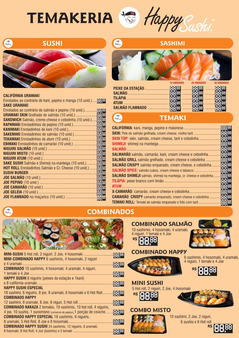 2 temaki*, 10 sashimi, 10 hot roll, 4 niguiri, 4 joe, 10 sushi, 1 sunomono (conserva de pepino 1 porção de ceviche