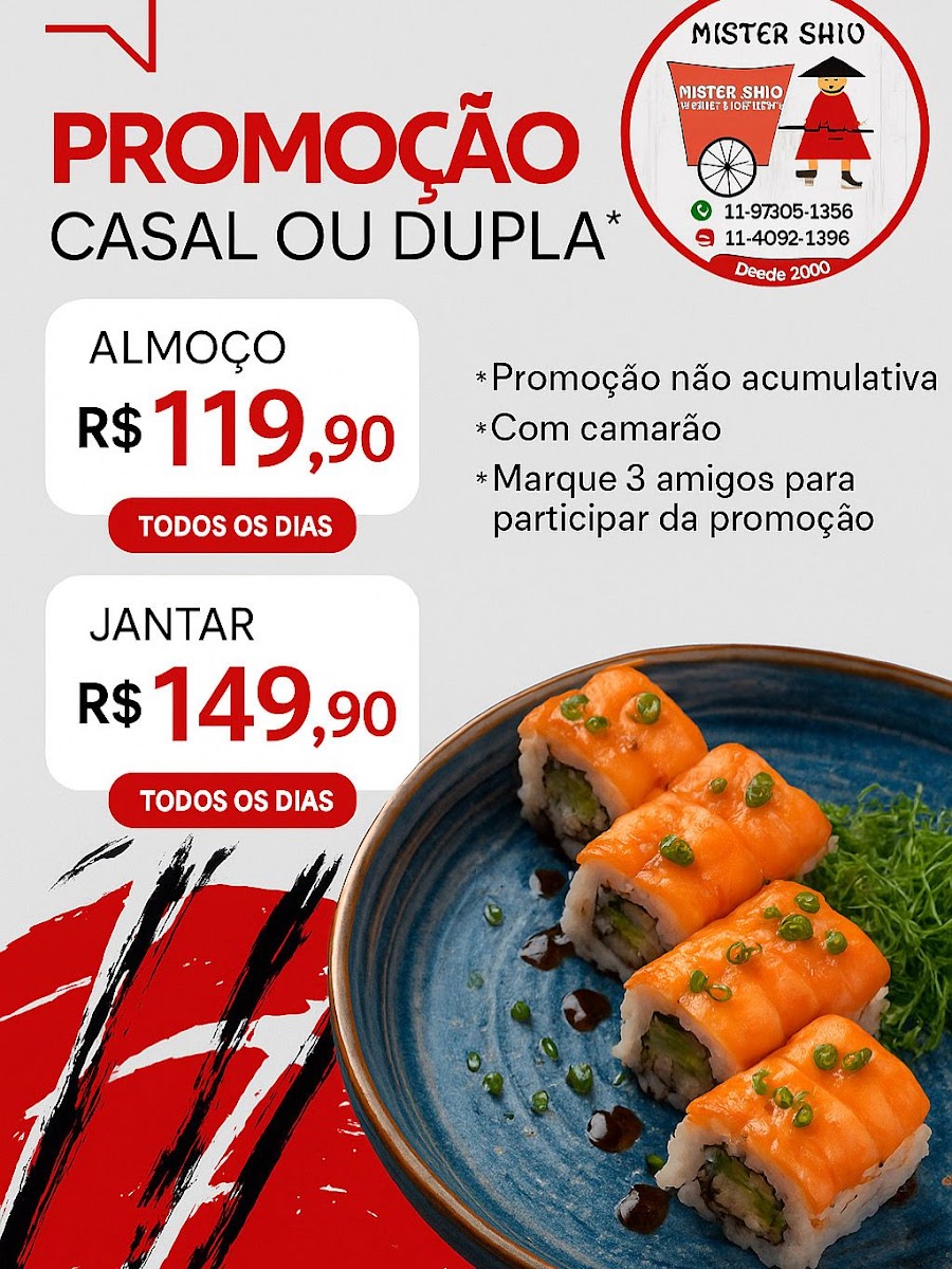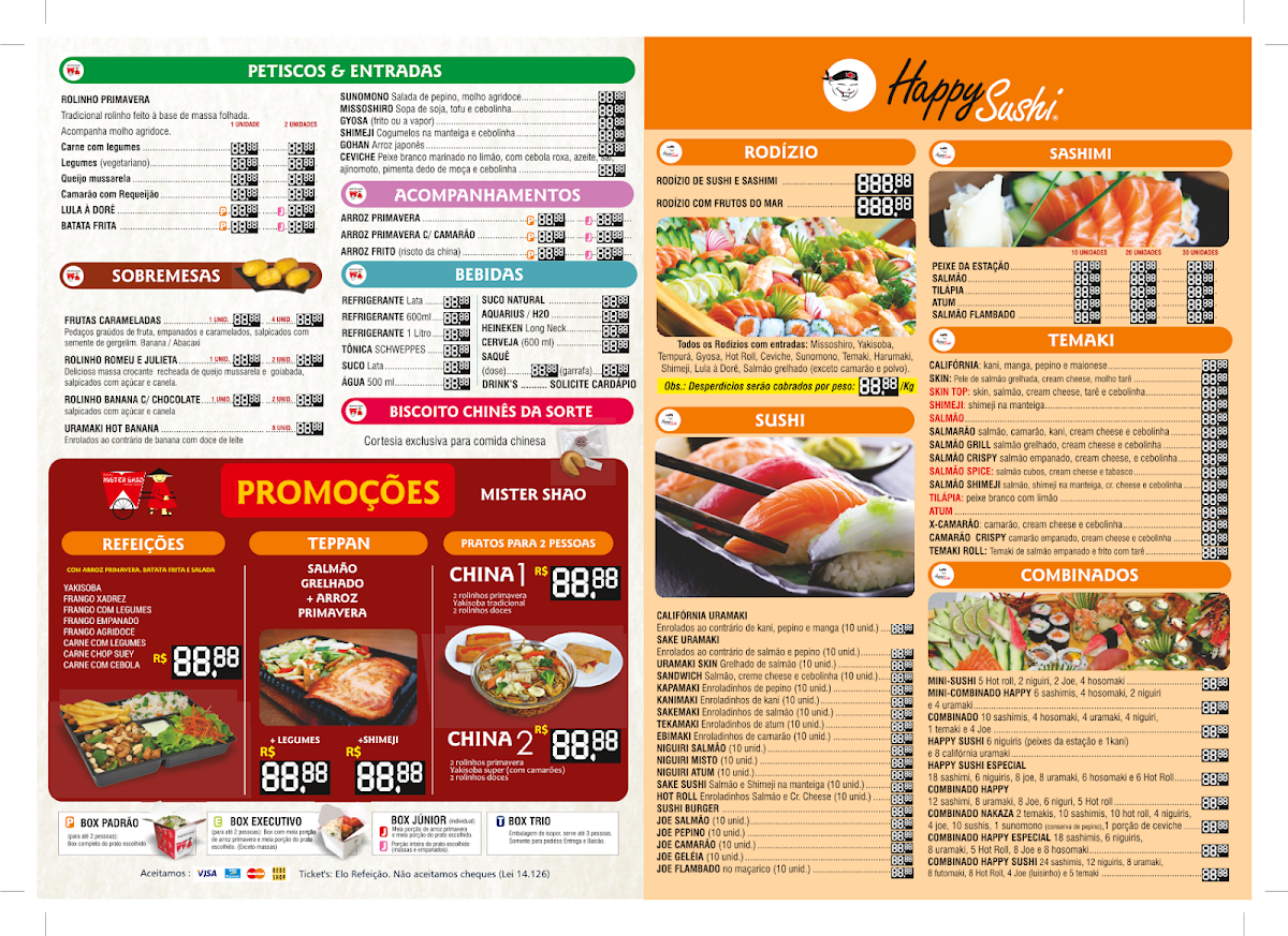 At Mister Shao & Happy Sushi in Bragança Paulista, the menu is a delightful exploration of both traditional and creative Japanese flavors. Sushi lovers will enjoy options like California Uramaki, Sake Uramaki, Uramaki Skinsandwich, and Kapamaki, while sashimi aficionados can choose from Peixe da Estação, Salmão, Tilápiaatum, and the indulgent Salmão Flambado, all served in portions of 10 units. For a more interactive experience, the temaki selection features Califórnia, Skin, Skin Topshimeji, and Salmão, each offering a unique twist on the classic hand roll. The restaurant’s combinados, including Mini-Sushi, Mini-Combinado Happy, Combinado Salmão, and the extensive Combinado Happy, allow diners to sample a variety of flavors in one sitting, complemented by traditional individual combos like Combo 1 through Combo 5. Those seeking something warm and indulgent can try the hots menu, featuring Temaki Roll, Hot Roll, Sushi Burger, and Hot Temaki, while the varied section highlights inventive creations like Barco Nakaza, Jou, Hosomaki Poke, and Jou Flambado. Drinks range from familiar choices like Coca lata and Água to larger bottles such as Refrigerante 1 litro Coca-Cola and Schweppes Citrus, ensuring refreshment options for every palate. For couples or duos, the Promoção Casal ou Dupla is available for both lunch and dinner, making it an appealing choice for shared meals. Overall, the menu strikes a balance between accessible favorites and inventive dishes, providing both quantity and creativity that leave a lasting impression on diners.